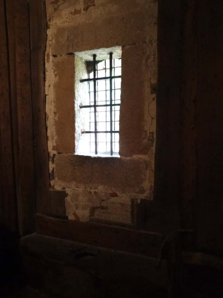 Al laatst kun je de gevangenis bezoeken. Je moet wel om de beurt naar boven, de trap is namelijk vrij smal. De gevangenis heeft wel wat benauwends. Het is een kleine ruimte, waar verder niks instaat. Het kleine raam brengt wat licht naar binnen, maar het is er evengoed vrij donker. Je ziet dat mensen hebben gekrast in het hout. Het is best bizar voor te stellen dat hier mensen hebben vastgezeten.